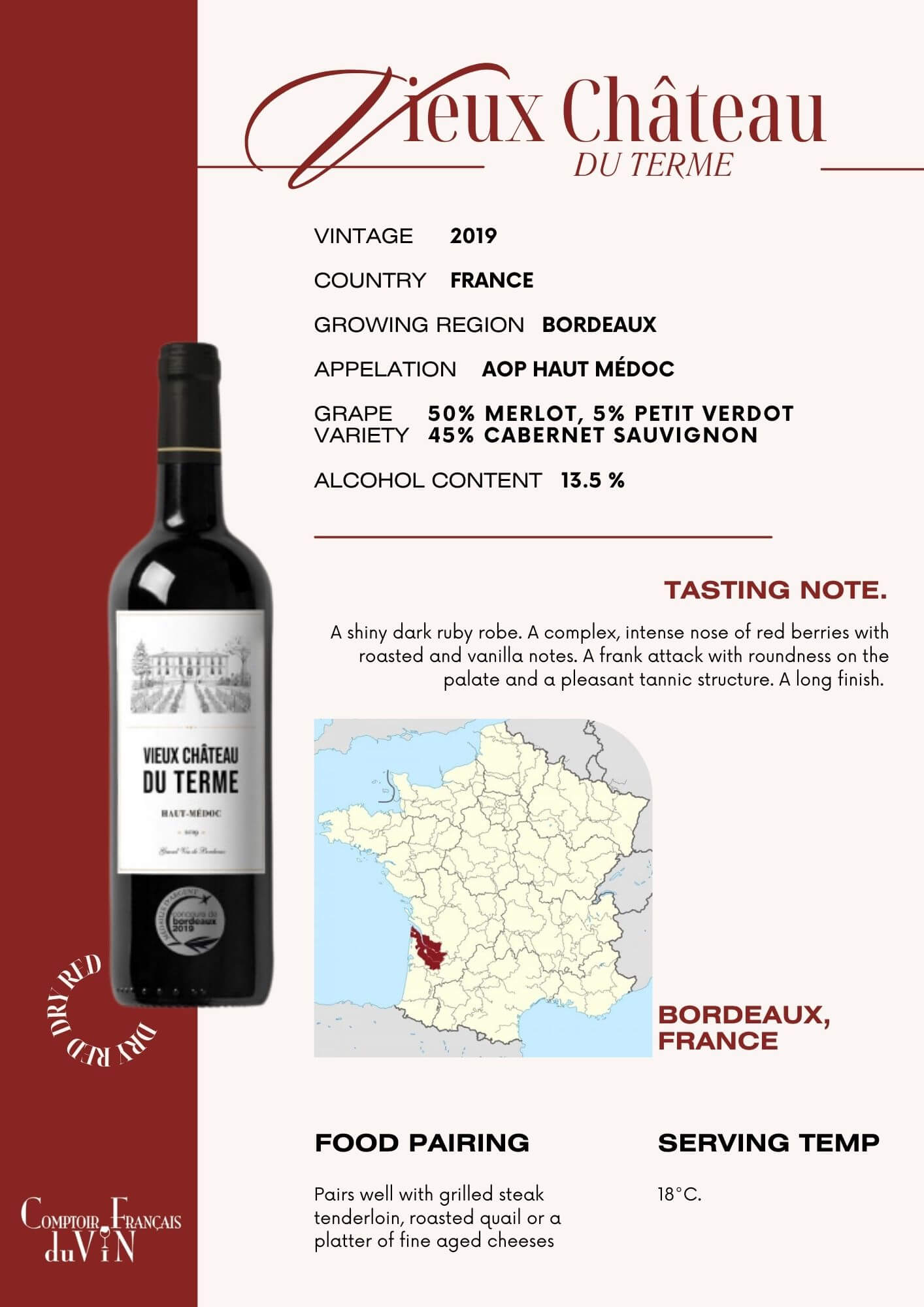 | grape | Cabernet Sauvignon, Merlot, Petit-Verdot |